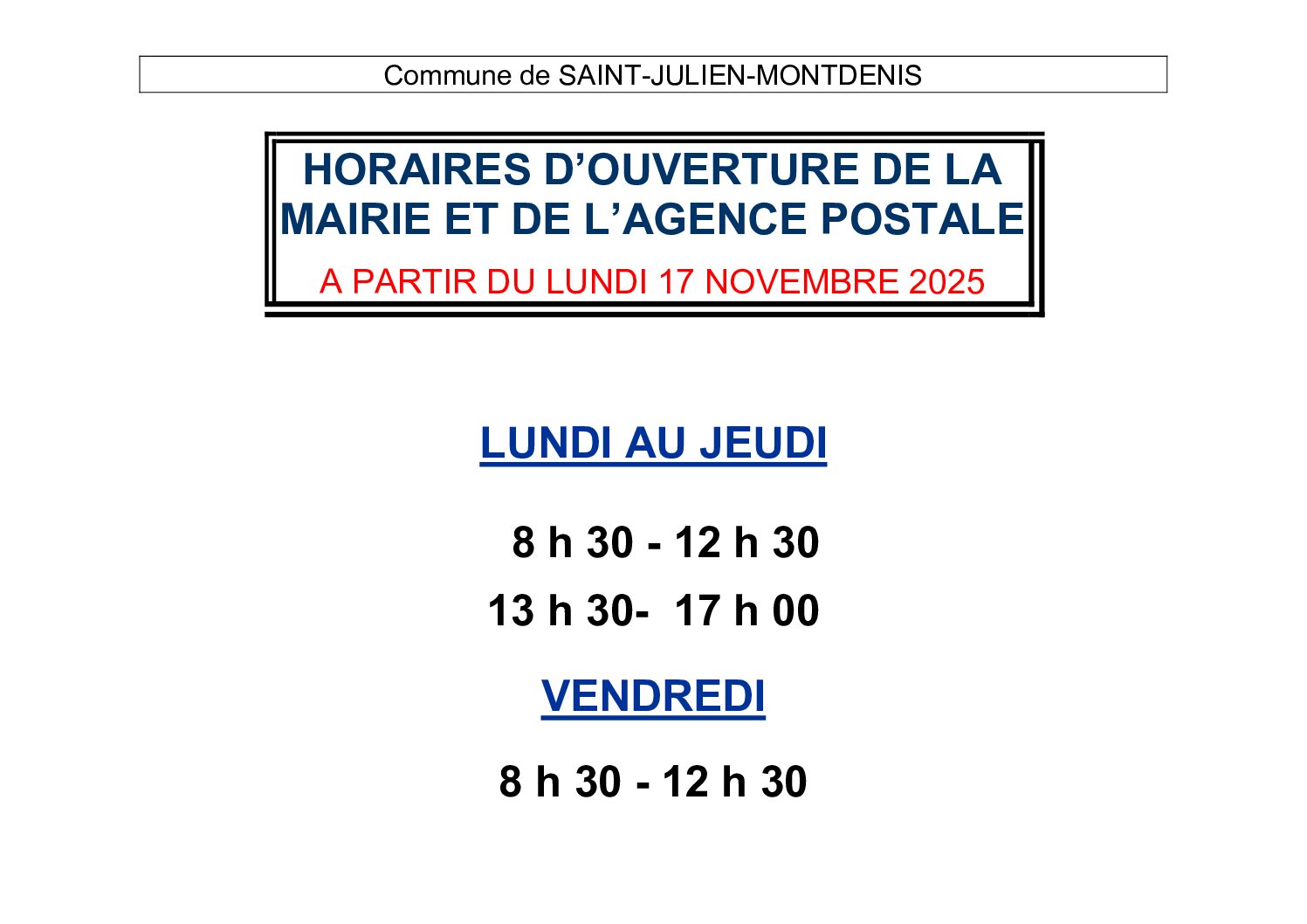 NOUVEAUX HORAIRES DE LA MAIRIE ET DE L’AGENCE POSTALE AU 17 NOVEMBRE 2025